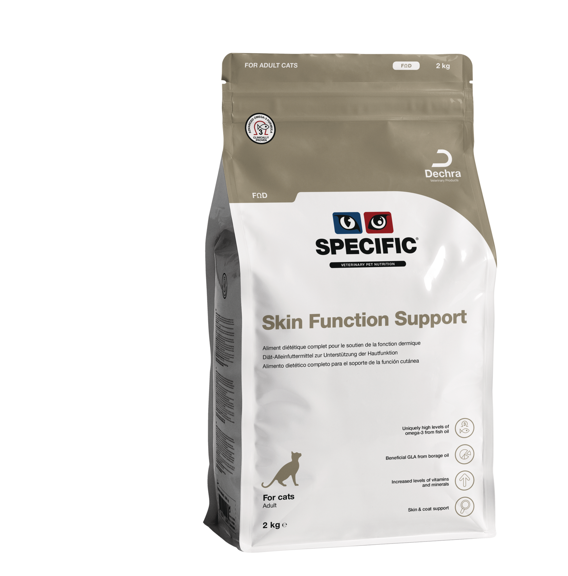 SPECIFIC™ FOD Skin Function Support – rekomenduojamas katėms su odos ir kailio problemomis, kurias teigiamai paveiktų padidintas odai reikalingų maistinių medžiagų, tokių kaip - polinesočiosios riebalų rūgštys, vitaminai ir mineralai, suvartojimas. Tinkamas šerti ir esant imuniniams sutrikimams bei uždegiminiams procesams, pavyzdžiui, astma, kolitas.